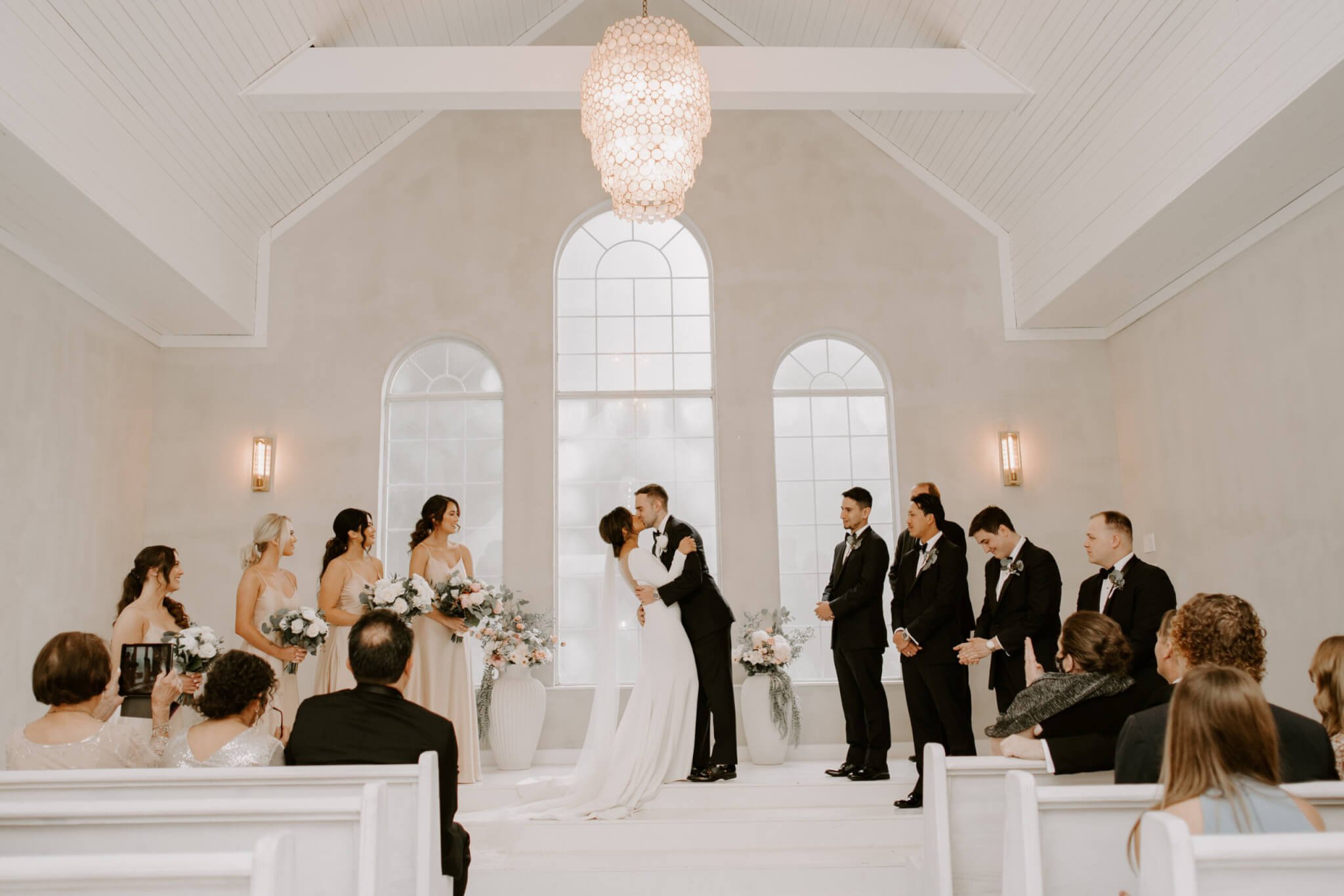 Some of the venue’s details that led I + C to choosing E for their BEST DAY EVER included the warm glow of our modern light fixtures + the off-white walls in the chapel, the homey feel of the reception area + the way it felt like they were hosting a big dinner party for 120 of their closest friends + family, and the relaxed atmosphere of our back patio + the string lights that hung over the dance floor!